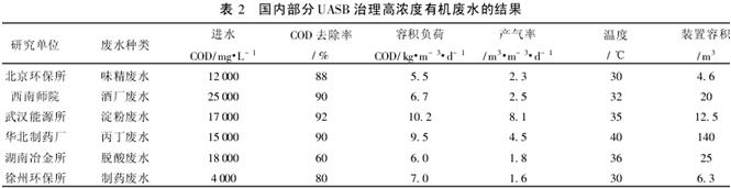 UASB是荷兰农业大学几名教授在AF基础上发展起来的,其特点是反应器的上部设置1个气、固、液三相分离器,混合液中的污泥能自动回到反应区以维持较多的生物量和较长的SRT,整个反应器由反应区和沉淀区两部分组成。从表2可以看出,UASB具有很高的容积负荷率和污泥负荷率。