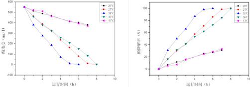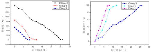图为相同的MLSS=3500mg•L-1,pH=7.2,T=25ºC,不同初始浓度下苯酚浓度与时间的关系图,从图中看出,酚初始浓度为550 mg•L-1时,经过8h时,酚初始浓度为855 mg•L-1时,经过12h,酚初始浓度为1500 mg•L-1时,苯酚经过26h,苯酚降解完全,降解率达到99%以上。