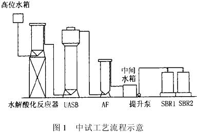 由于废水浓度很高,且可生化性较好,因此采用厌氧-好氧处理工艺。废水首先进入水解酸化器,在此进一步提高可生化性,同时又去除大部分悬浮物;水解酸化段的出水进入UAS【水处理技术】B反应器;经UASB反应器处理后的废水(悬浮物含量较低),进入AF工艺;由于废水中氨氮浓度较高,好氧处理采用了具有较强脱氮能力的SBR工艺。中试工艺流程见图1。