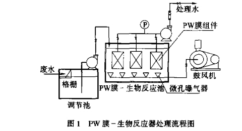 PW—W膜生物反应器将膜组件安装在生物反应器中,底部安装有微孔曝气器,通过曝气装置出来的气液混合流作为折向过滤流程来实现过滤和清洗膜表面,其处理流程可用图1表示。