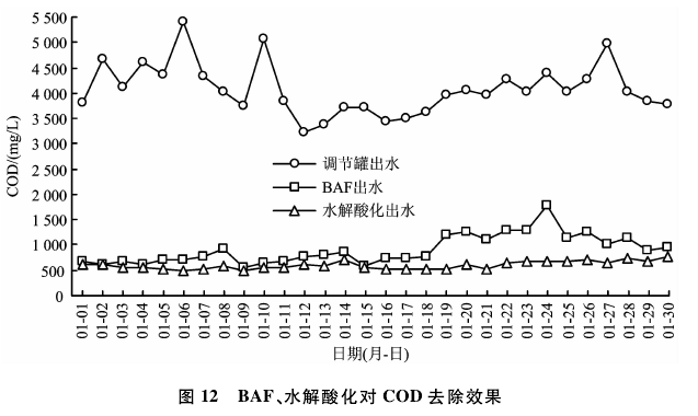 曝气生物滤池抗冲击负荷能力强,进水 COD为3000~5500mg/L波动条件下,出水 COD趋于平稳;曝气生物滤池大幅削减废水有机污染物,对COD去除率高达 77.8%;水解酸化虽然对 COD的去除率较低,但其实现“水质稳定器”作用,使出水COD平稳。