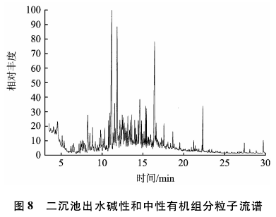 生化二沉出水酸性及碱性、中性萃取物的 GC/MS分析结果见图 7和图 8。