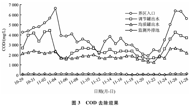 由图 12可知,升级改造后调节罐出水 COD平均值为 4073.5mg/L,比较大值为 5395.0mg/L;经曝气生物滤池好氧氧化后出水 COD平均值为 902.5mg/L,比较 大 值 为 1790.0 mg/L,COD 去 除 率 为77.8%;经水解酸化后出水 COD平均值为 598.0mg/L,比较大值为765.0mg/L,COD去除率为33.7%。