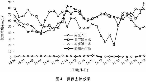 污水处理厂界区入口处 COD的平均值为3887mg/L,比较大值为 6631mg/L;经隔油处理、均质调节后,COD的平均值为1947mg/L,比较大值为2268mg/L;经 A2O生化池 +MBR+臭氧氧化后,COD的平均值为 107mg/L,比较大值为 139mg/L。各处理单元氨氮监测指标见图 3。由图 3可知,进水 COD大幅超设计标准,处理后污水不能达标排放。