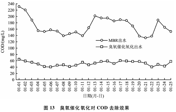 由图 13可知,升级改造后 MBR出水 COD平均值为165.6mg/L,比较大值为231.0mg/L;经臭氧催化氧化后出水 COD平均值为 50.6mg/L,比较大值为64.0mg/L,COD去除效率为 69.4%。原设计的臭氧氧化塔,装填催化剂形成臭氧催化氧化后,在相同塔容、水力停留时间条件下,臭氧对污水中有机物的氧化效率更高并能保证出水 COD平稳。