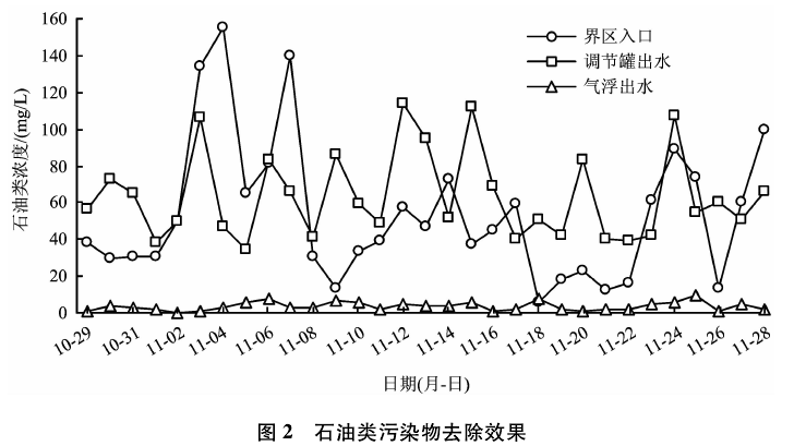 污水处理厂界区入口处石油类污染物的平均浓度为 53.74mg/L,比较大值为 155.00mg/L;经调节罐隔油处理后,石油类污染物的平均浓度为 63.77mg/L,比较大值为 114.00mg/L;经斜板隔油—两级气浮后,出水石油类污染物的平均浓度为 3.57mg/L,比较大值为 9.36mg/L。各处理单元石油类污染物监测指标见图 2。由图 2可知,石油类污染物可达标排放。
