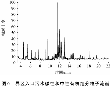 界区入口污水酸性及碱性、中性萃取物的 GC/MS分析结果见图 5和图 6。由图 5和图 6可知,其主要污染物为环烷酸、低级脂肪酸、含氮杂环化合物及苯酚类化合物。