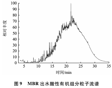MBR出水酸性及碱性、中性萃取物的 GC/MS分析结果见图9和图10。由图9和图10可知,其主要污染物为环烷酸、茚酮类、环烯(烷)烃、含氮杂环化合物及邻苯二甲酸酯类。