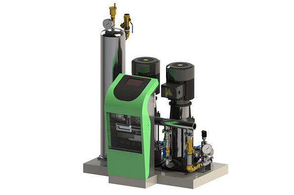 定压补水装置设备采用系统静压作为膨胀水箱内的设计初始压力水头,采用保证系统内热水不汽化的压力作为膨胀水箱内动行终端压力水头。初始运行时首先启动补水泵向系统及气压罐内的水室中充水,系统充满后多余的水被挤进胶囊内。因为水的不可压缩性,随着水量的不断增加,水室的体积也不断的扩大而压缩气室,罐内的压力也不断的升高。当压力达到设计压力时,通过压力控制器使补水泵关闭。当系统内的水受热膨胀使系统压力升高超过设计压力时,多余的水通过安全阀排至补水箱循环使用,当系统中的水由于泄露或温度下降而体积缩小,系统压力降低时,胶囊中的水被不断压入管网补充系统的压降损失,当系统压力至设计允许的最低压力时,通过压力控制器使补水泵重新启动向管网及气压罐内补水,如此周而复始。